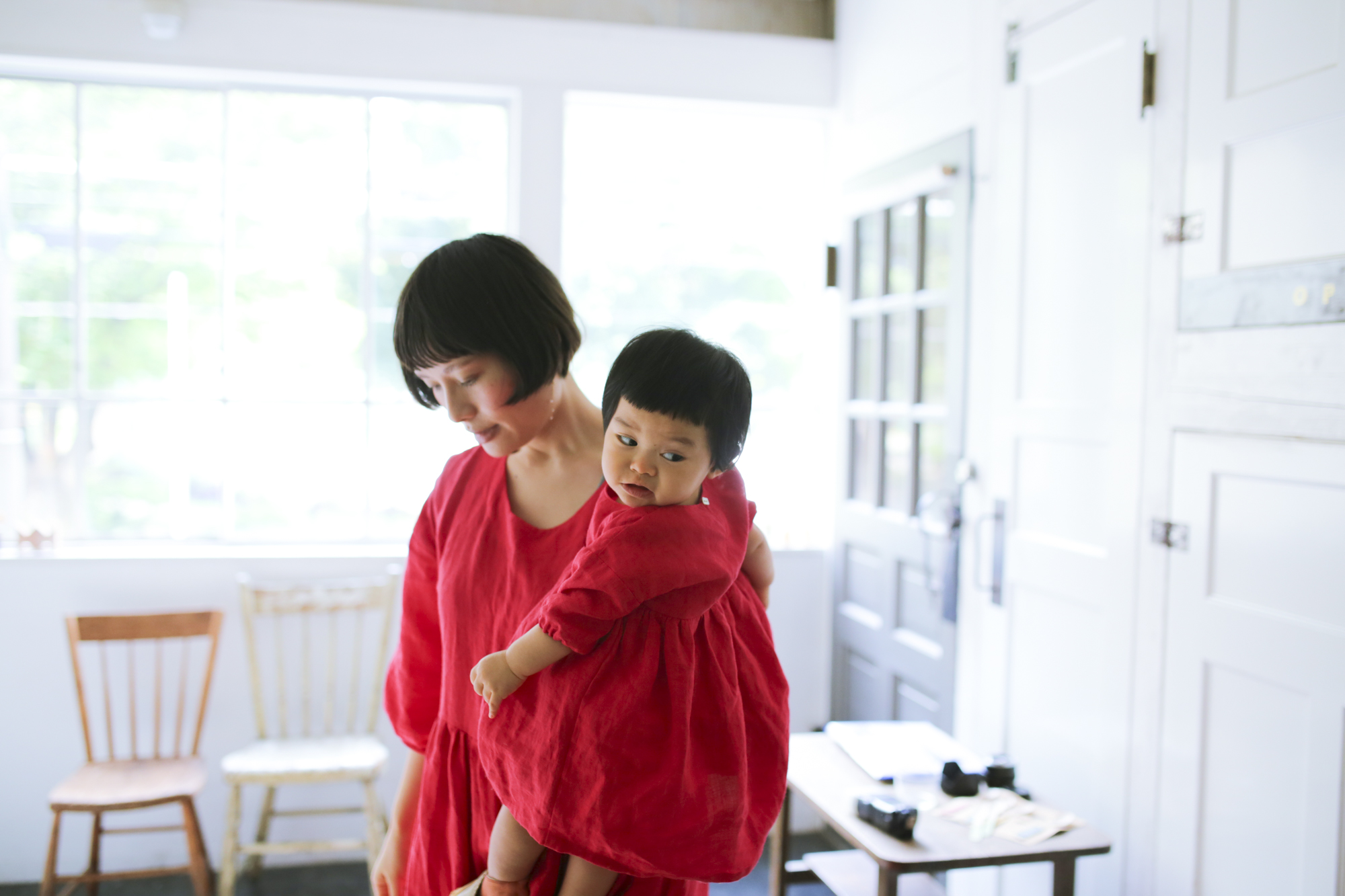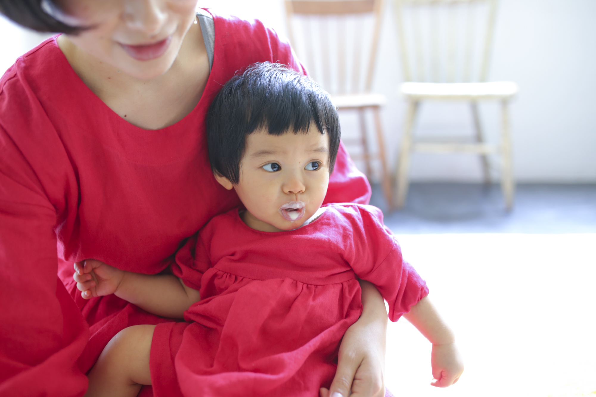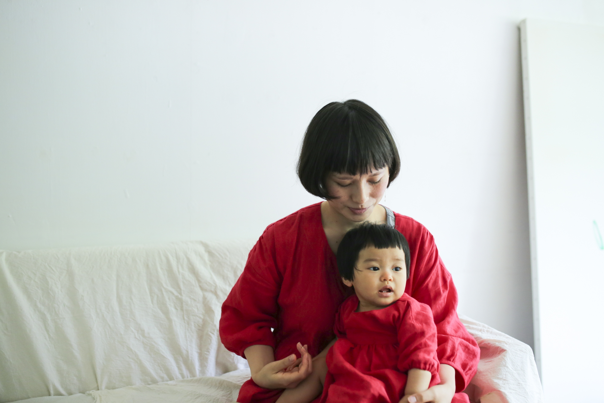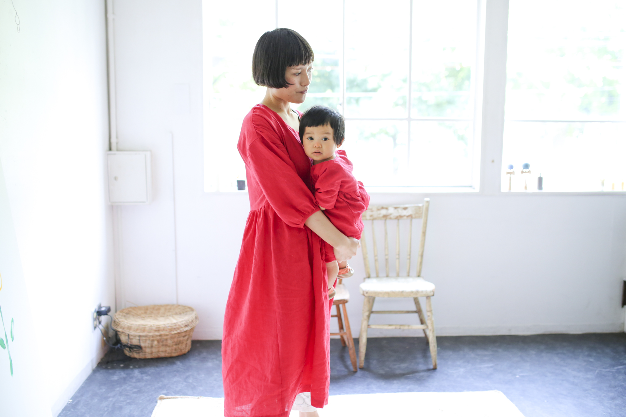 お揃いの赤いワンピースはMAISONETTEinc.で制作。